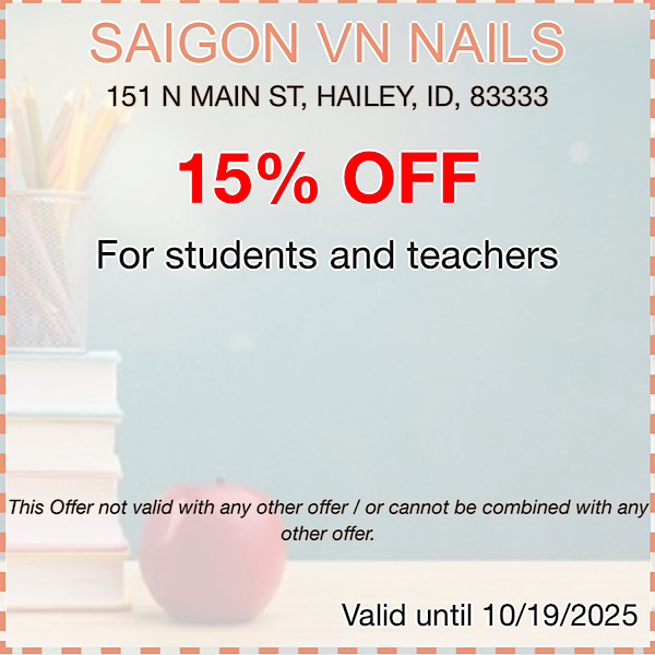 SAIGON VN NAILS is the IDEAL destination for nail services in the center of HAILEY ID 83333 . We are dedicated to bring TOP line products mixed with EXPERT technique to the nail salon industry and an AFFORDABLE price. Our specialties includes Nails, Manicure, Nail enhancements, Extra Services, Kid Services and Waxing.